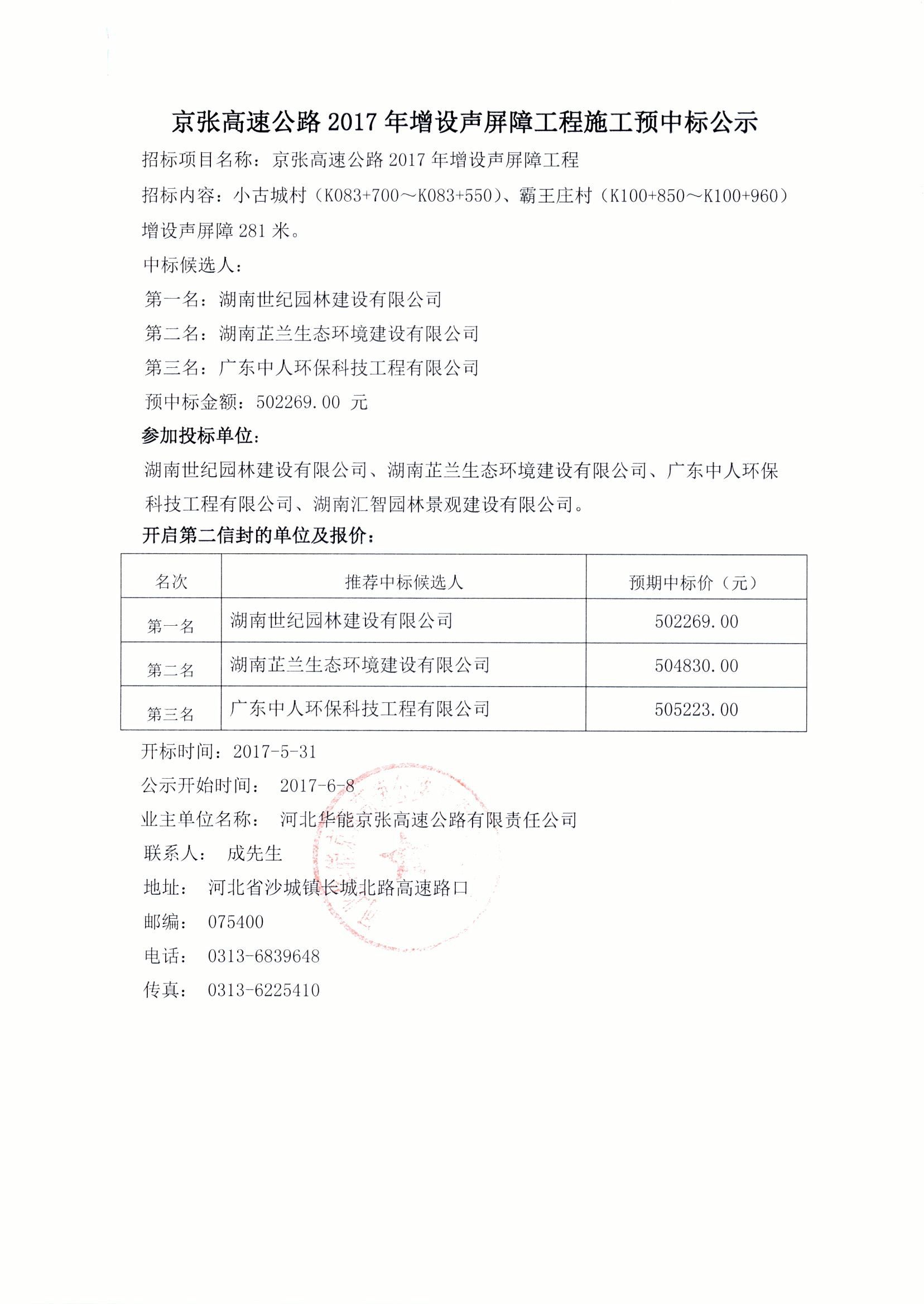 2017年增設聲屏障工程預中標公示