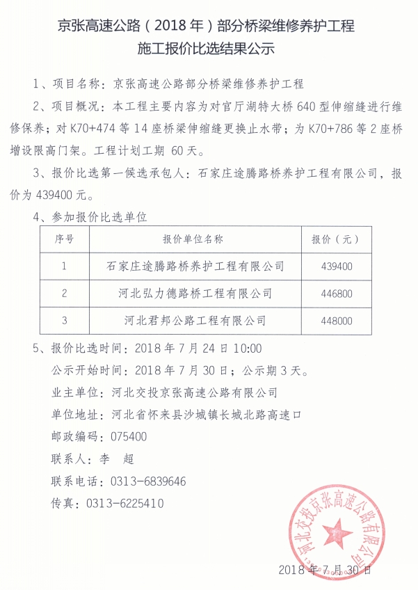 京張高速公路(2018年)部分橋梁維修養(yǎng)護(hù)工程施工報(bào)價(jià)比選結(jié)果公示
