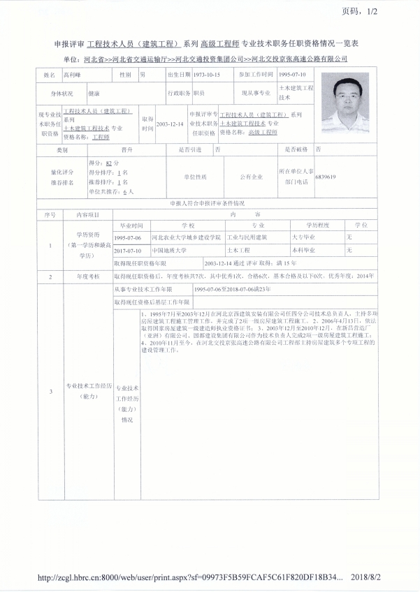 京張公司2018年度專業(yè)技術(shù)職稱申報(bào)公示(高利峰)