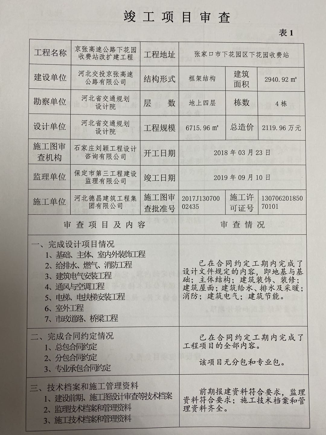 京張高速公路下花園收費站改擴建工程竣工驗收報告